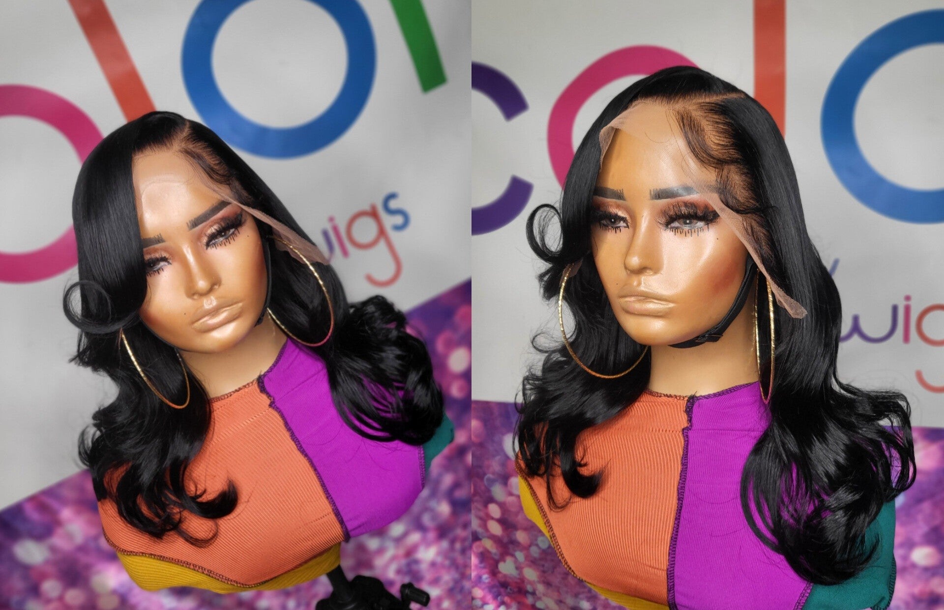 This beautiful wig has a length of 18 inches. Layered. Black. Length is measured from the crown to hair tips. The density is 180, equipped with adjustable straps (wig can be tighten to 20.5 and loosen up to 24.5) and combs. 13x4 Lace Frontal Wig. Glueless.