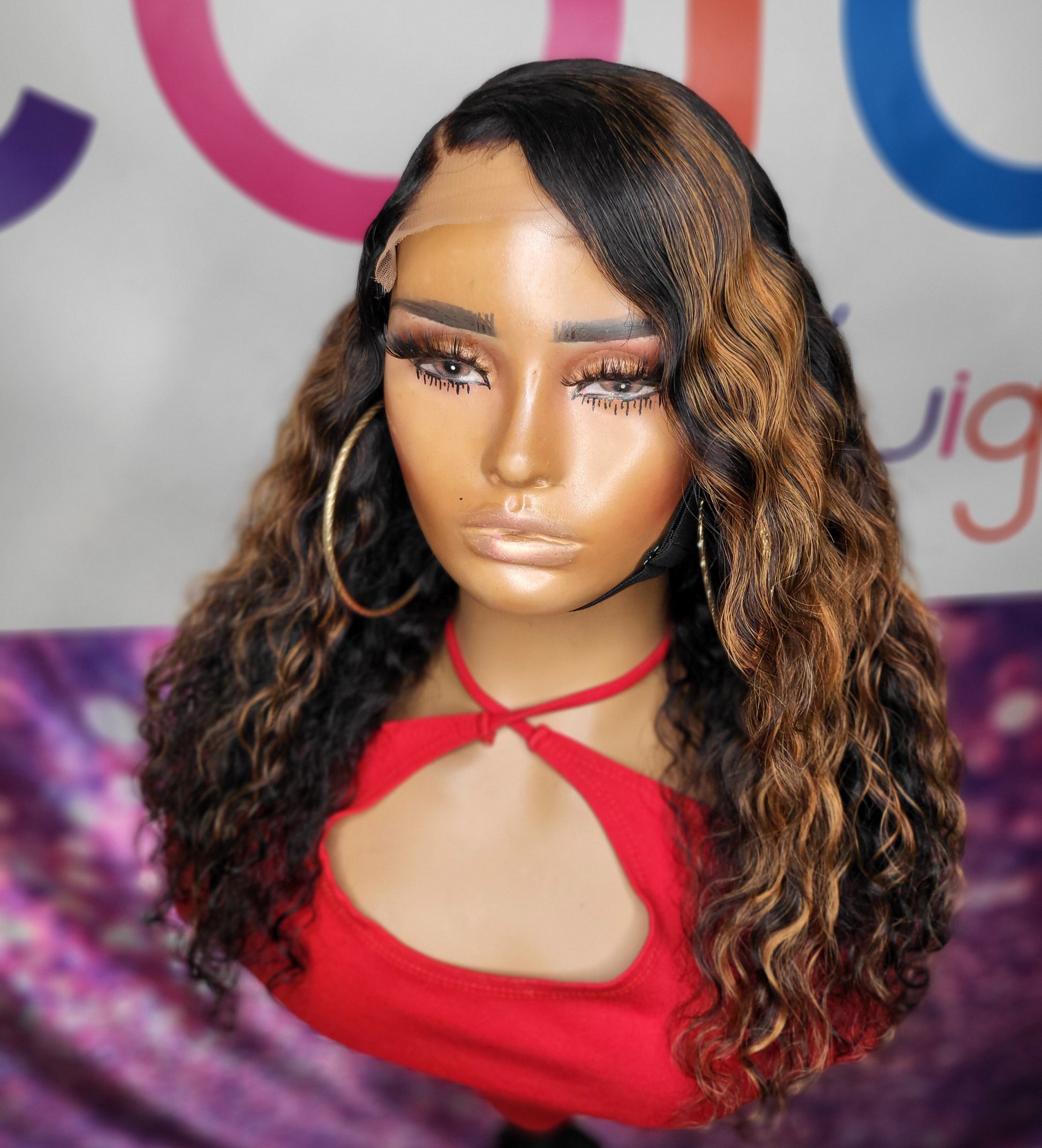 This beautiful wig has a length of 16 inches. Custom Color Highlights. Length is measured from the crown to hair tips. The density is 150, equipped with adjustable straps (wig can be tighten to 20.5 and loosen up to 24.5) and combs. This is a 4x4 Lace Closure Wig. Glueless.