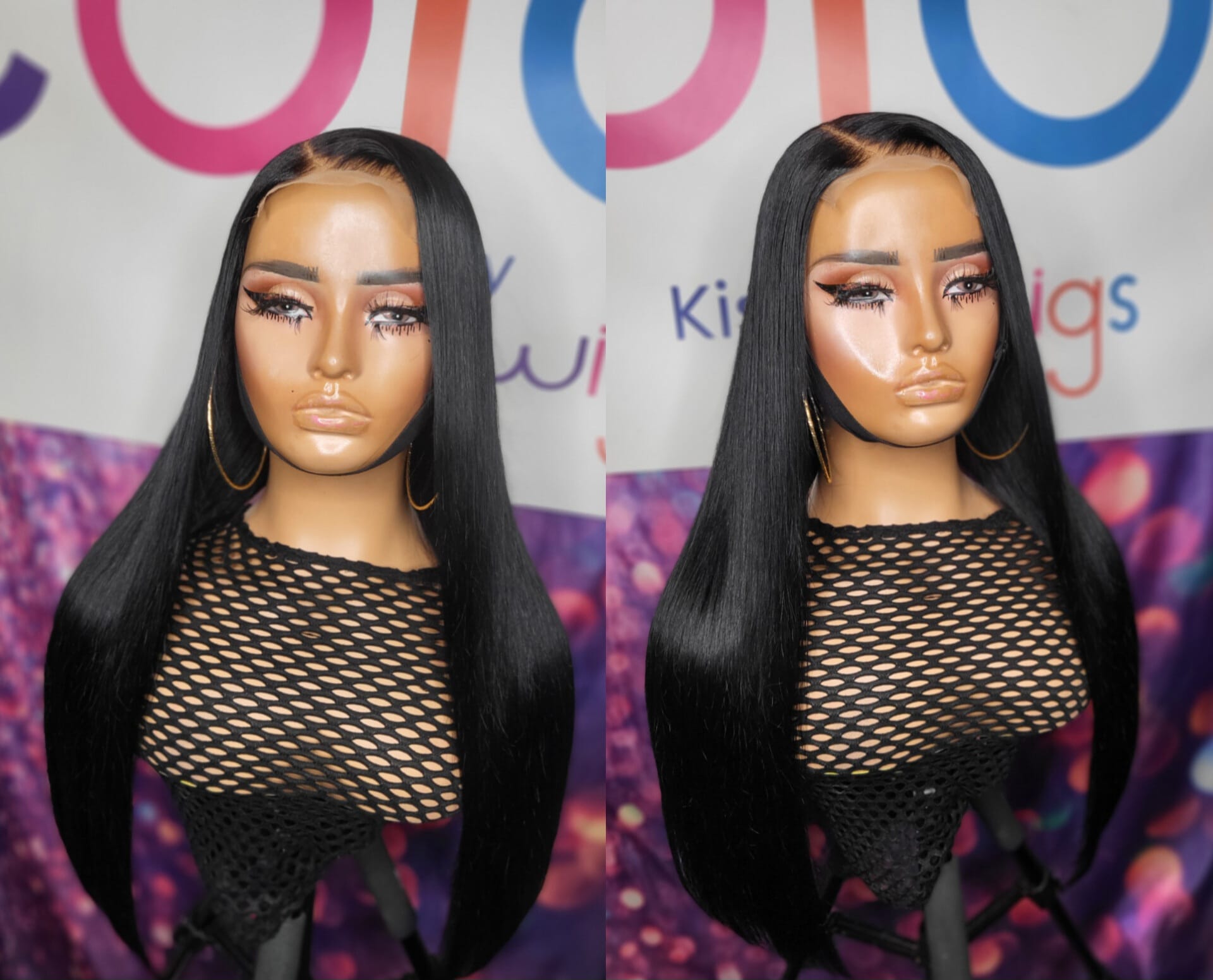 This beautiful wig has a length of 18-26 inches. Trimmed. Length is measured from the crown to hair tips. Black. The density is 200, equipped with adjustable straps (wig can be tighten to 20.5 and loosen up to 24.5) and combs. 4x4 Lace Closure Wig. Straight. Glueless. This wig is ready to purchase and is customized to order.