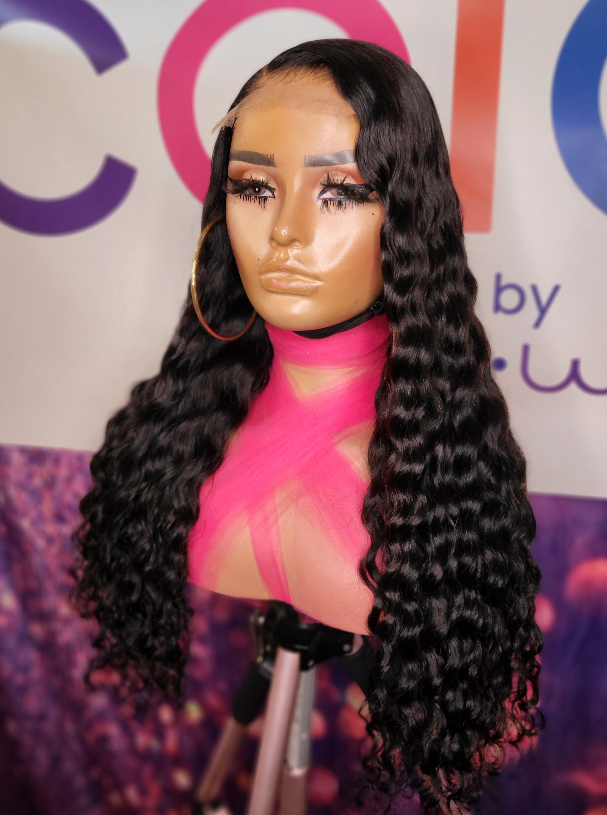 This beautiful wig has a length of 18-24 inches. Length is measured from the crown to hair tips. The density is 220, equipped with adjustable straps (wig can be tighten to 20.5 and loosen up to 24.5) and combs. This wig is ready to purchase and is customized to order. 4x4 Lace Closure Wig. Deep Wave. Glueless.