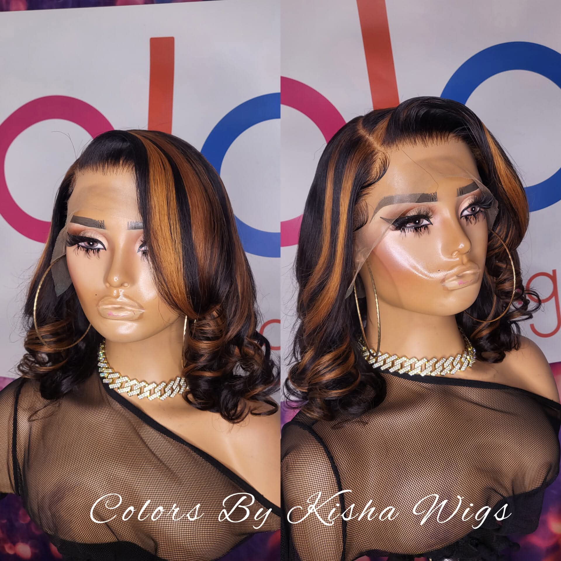 This beautiful wig has a length of 16 inches. Custom Color Highlights. Length is measured from the crown to hair tips. The density is 180, equipped with adjustable straps (wig can be tighten to 20.5 and loosen up to 24.5) and combs. 13x4 Lace Frontal Wig. Glueless. This wig is ready to purchase and is customized to order.